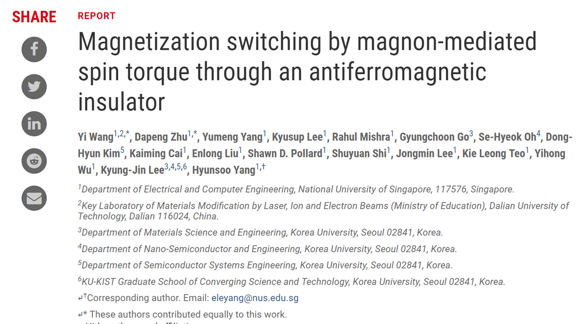 2019年11月29日,我院王译教授与新加坡国立大学Hyunsoo Yang教授,在世界顶级期刊Science (《科学》)上发表重要工作:利用自旋波翻转磁矩实现数据存储与逻辑运算[1]。