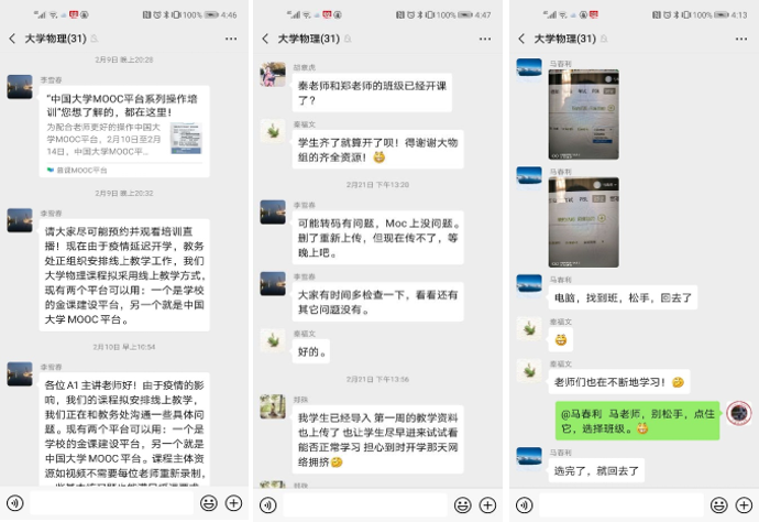 大学物理教学团队由“老、中、青”三代教师组成,承担着全校工科班、预科班、国际班、机械英文班共四个班型的物理课程教学工作。面对疫情,在短时间内完成从讲台到云端的转变,对老师们具有一定的挑战。春节刚过,团队教师就开始着手准备线上教学工作,并在开学前两周正式进入备战倒计时状态。大家互切磋、共出谋,集广义、开渠道,最终确定了以我校大学物理国家级精品资源共享课程、中国大学mooc平台开放课程为依托,以“大工-超星平台”及“大工-爱课程” 平台为支撑,以学习通、QQ、微信等终端为辅助的云端教学架构,以此做到视频共享、资源共享、特色化分班辅导,教师引领、自主学习,最大程度发挥网课优势。