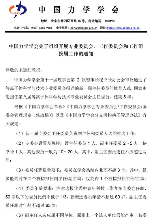 近期,我校广发网页版宋远红教授当选为中国力学学会第十一届理事会理事,并通过中国力学学会第十一届理事会第二次理事长秘书长办公会审议,正式成为第八届等离子体科学与技术专业委员会主任委员,任期5年。