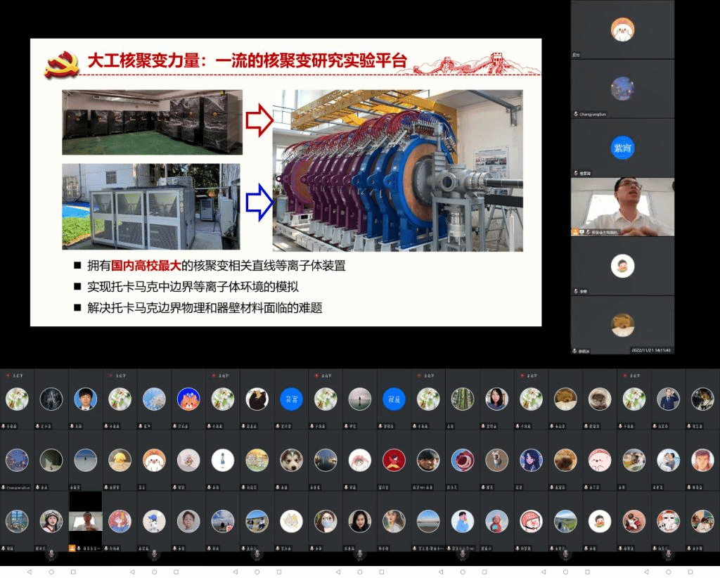 11月21日,广发网页版党委落实学校党委部署,推进学院学习贯彻落实党的二十大精神“奋进新征程”系列活动,邀请学校学习贯彻党的二十大精神师生宣讲团成员、广发网页版等离子体物理教工党支部书记桑超峰教授,为学院全体师生党员作《加强科技创新 推动核聚变能发展》专题报告。