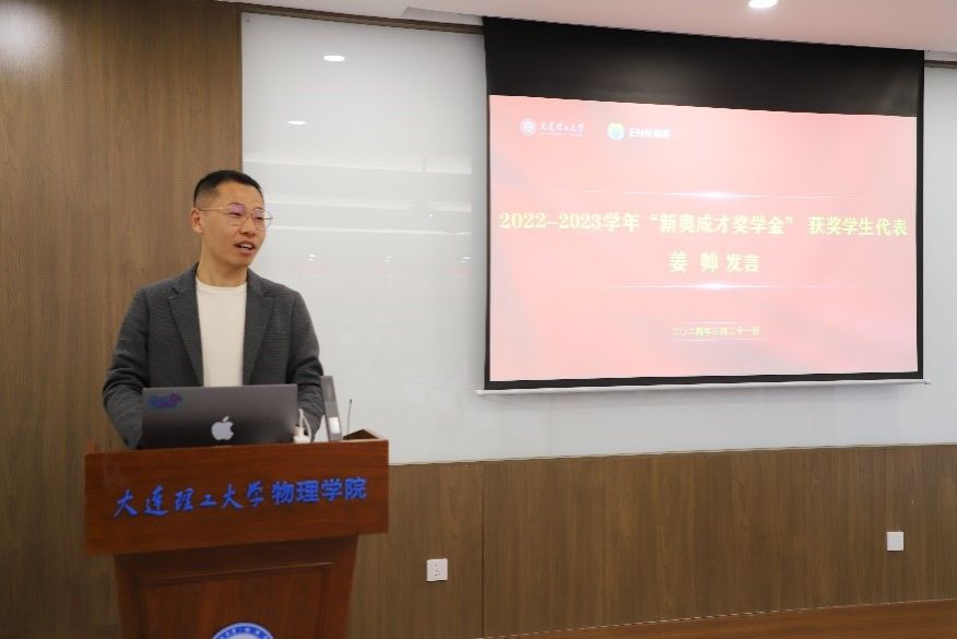 2022-2023学年新奥成才博士一等奖学金获奖者姜帅代表获奖学生对新奥集团设立奖学金表示感谢,并表示将不断丰富科研能力,提高责任意识,用自己的成绩回馈母校、回报社会。