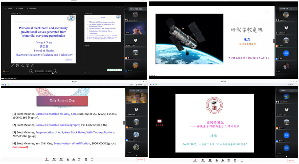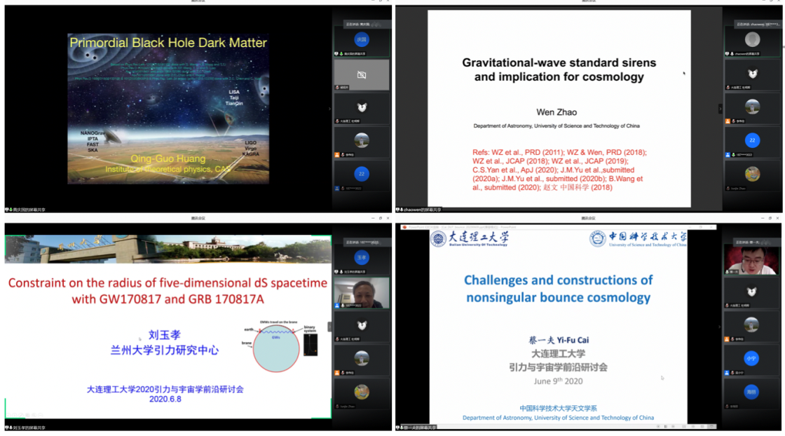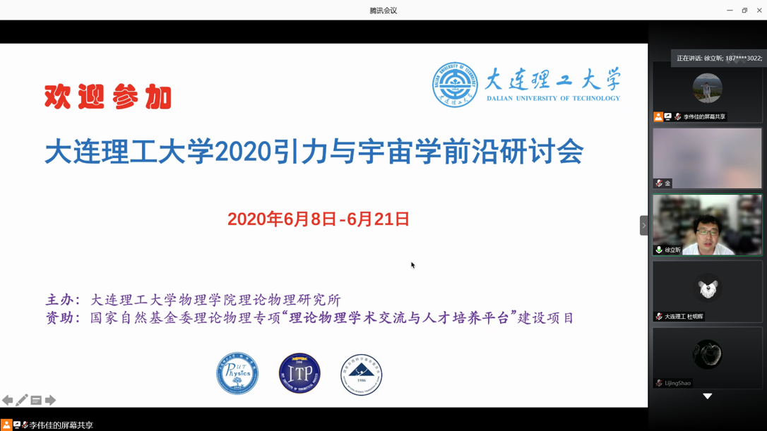 2020年6月8日-6月21日,由广发平台理论物理研究所主办的“大连理工大学2020引力与宇宙学前沿研讨会”成功召开。本次会议受国家自然基金委理论物理专项“理论物理学术交流与人才培养平台建设项目”资助,组织者为大连理工大学徐立昕教授和李伟佳副教授。会议采用了“腾讯会议”进行线上学术交流,共有中科院及海内外50余所兄弟院校和科研院所的100余名引力与相对论领域的专家报名参会(峰值在线人数为160余人)。