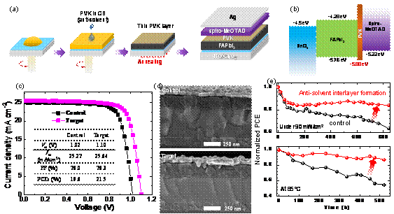 成果简介:这项技术的发展重点是实现高效、稳定的PSCs并探清其物理机制。目前,绝大多数高效稳定的PSCs都是基于多阳离子混合阴离子的组合物,其中甲基铵的热不稳定性和混合卤化物组分的相分离倾向严重限制了PSCs的长期稳定性。近日,博士后王敏焕在该领域取得突破性进展。首次提出了原位反溶剂界面PVK钝化技术,实现了基于完全无铯、无甲基铵和无溴钙钛矿组分(FAPbI3)的太阳电池,稳态效率达19.36%,且光热稳定性大幅提升。该成果将为高性能钙钛矿光电器件的研制和实用化提供理论依据和实验技术指导。以“Stable and Efficient Methylammonium, Cesium, and Bromide-free Perovskite Solar Cells by in-situ interlayer formation”为题,发表在《Advanced Functional Materials》上。论文第一作者为广发平台博士后王敏焕,大连理工大学边继明教授、韩国成均馆大学Jin-Wook Lee教授和美国加州大学洛杉矶分校Yang Yang教授为共同通讯作者。该成果得到国家自然科学基金等项目资助。王敏焕于2020年6月博士毕业于大连理工大学微电子学院,现为边继明教授课题组博士后。博士期间荣获校学术之星、研究生国家奖学金(3次)、辽宁省优秀毕业生等多项奖励,在Advanced Materials, Nano Energy, ACS Applied Materials & Interfaces等材料能源领域国际期刊发表论文近20篇。一直从事钙钛矿光电材料与器件研究,并先后在本领域国际顶级科学家美国加州大学洛杉矶分校YangYang课题组和韩国成均馆大学N.G. Park课题组联合培养。