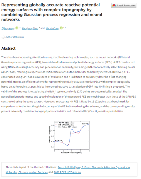 相关的研究成果以“Representing globally accurate reactive potentialenergy surfaces with complex topography bycombining Gaussian process regression andneural networks”为题作为封面文章发表在物理化学领域的Top期刊《Physical Chemistry Chemical Physics》,并入选2022 PCCP HOT Articles。同时,RSC China官方微信平台对该成果进行了亮点推送。文章第一作者是学院博士后杨紫江,陈茂笃教授为本文的通讯作者。该研究得到了国家自然科学基金资助。