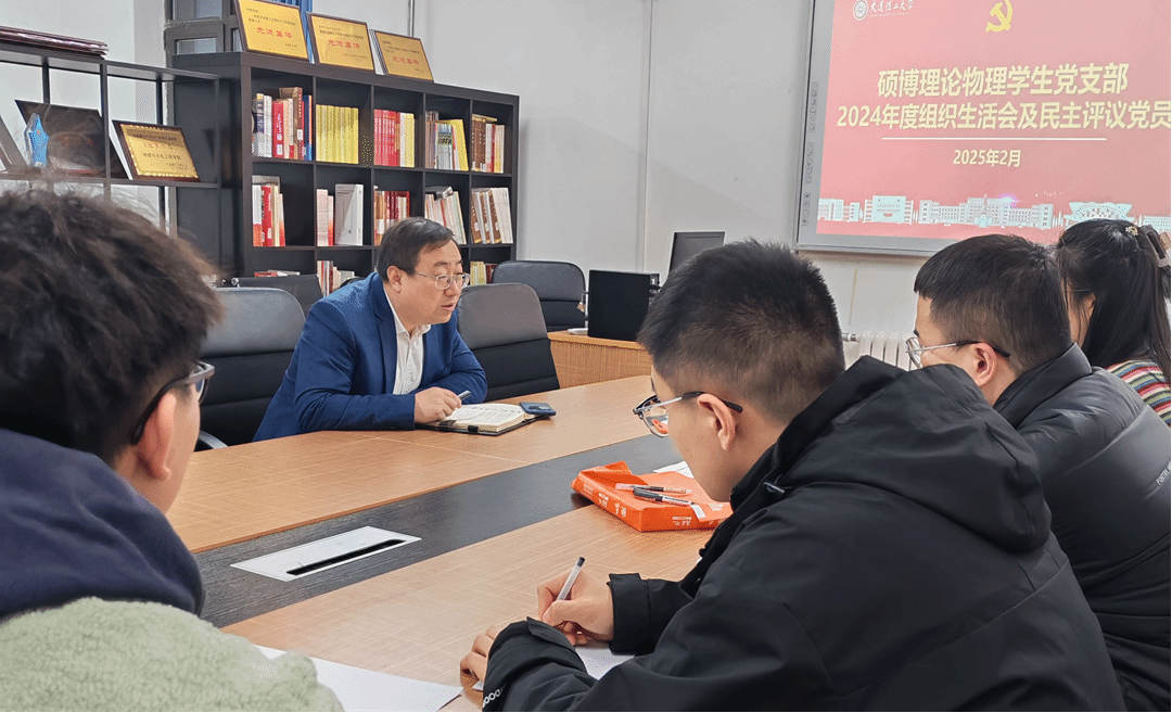 为深入学习贯彻党的路线方针政策,加强党组织建设,进一步推动全体党员的思想觉悟与行动相统一,广发网页版硕博理论物理学生党支部于2月27日晚在物理楼422室召开了2024年度组织生活会暨民主评议党员大会,本次会议通过批评与自我批评、领导点评等环节,全面推动思想建党与制度治党同向发力。本次会议由支部书记韩钰芬同志主持,学院党委书记于长水教授莅临指导,支部全体党员参会。