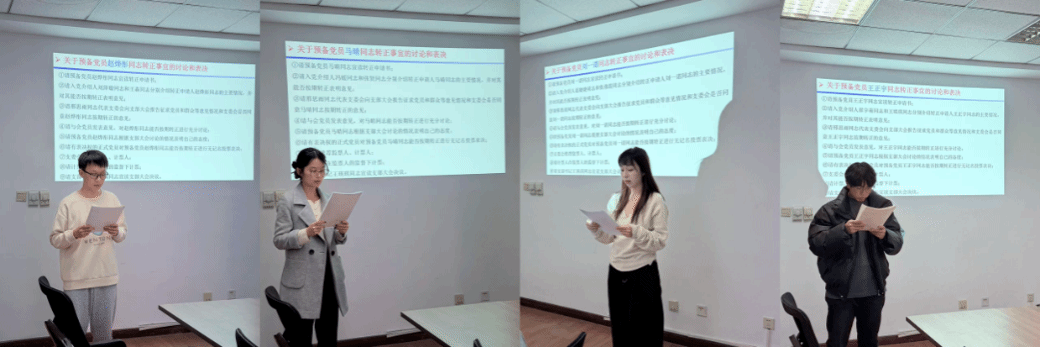 会议第四项,对四名中共预备党员的转正事宜依次进行讨论和表决。大会严格按照程序进行。中共预备党员赵烨彤、马晴、刘一诺、王正宇四名同志依次宣读了转正申请,汇报了预备期间的思想理论学习和工作生活情况。接下来,由各自的入党介绍人分别介绍对于四位同志的考察情况,并提出了同意转正的意见。随后,组织委员邢思雨同志代表党支部委员会分别宣读四位同志按期转正的考察意见。到会党员也分别对四位中共预备党员一年来的表现进行了客观、认真的评价,肯定他们在预备期间在各个方面上的提高,认为他们已经具备了成为正式党员的素质,并对其今后的工作提出了意见和希望。经过全体与会正式党员投票表决,一致通过四位同志转为中共正式党员。四位同志认真听取意见与建议,纷纷表示在今后的学习生活中将会更加严格地要求自己,发挥党员先锋模范作用。