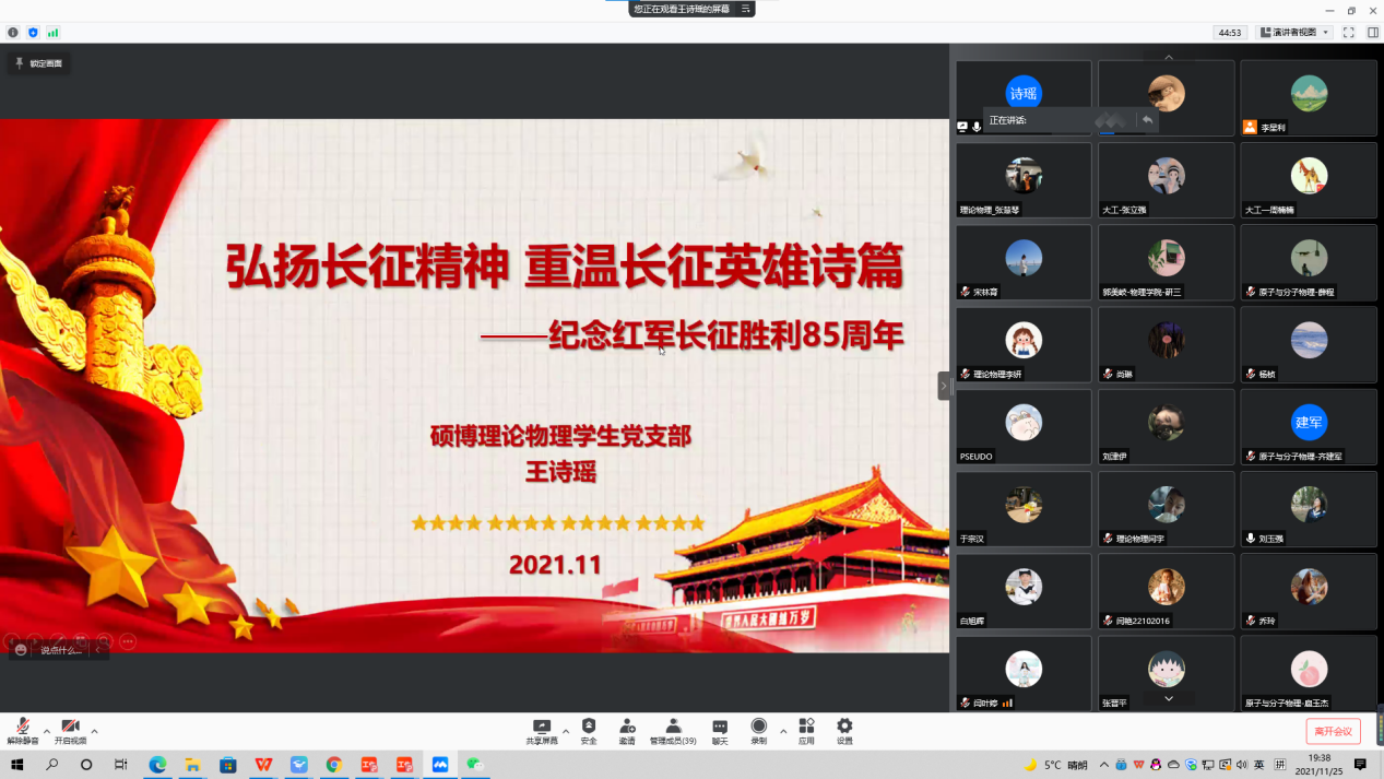 为深入学习贯彻党的十九届六中全会精神,深刻把握伟大长征精神的丰富内涵,进一步提高党员党性修养,不断坚定理想信念,传承红色基因,坚守初心使命。2021年11月25日,硕博理论物理学生党支部、硕博原子与分子学生党支部以腾讯会议的形式联合开展主题党日活动,努力做到共学共享,不断汲取奋进的精神力量。本次学习成员包括党员、发展对象、积极分子和部分群众共40名,会议由硕博理论物理学生党支部书记刘玉强同志主持。