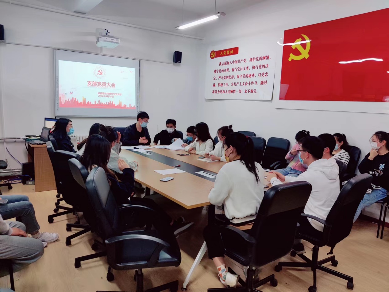 在疫情形势仍然复杂严峻的当下,为深入学习习近平总书记3月17日广发网页版统筹疫情防控和经济社会发展精神,不断提高政治站位,坚定政治立场;深入学习中国共产党人的精神谱系,坚持思想上学习不放松,切实提高思想觉悟;加强支部力量建设,积极为党组织吸收新鲜血液。硕博理论物理学生党支部支部于2022年4月26日召开全体党员大会。会议由支部书记刘玉强同志主持,全体党员,发展对象,积极分子和部分群众参加。会议分为三项,第一项为“弘扬伟大抗疫精神和东北抗联精神”主题党课学习;第二项为预备党员转正事宜;第三项为确定发展对象相关事宜。