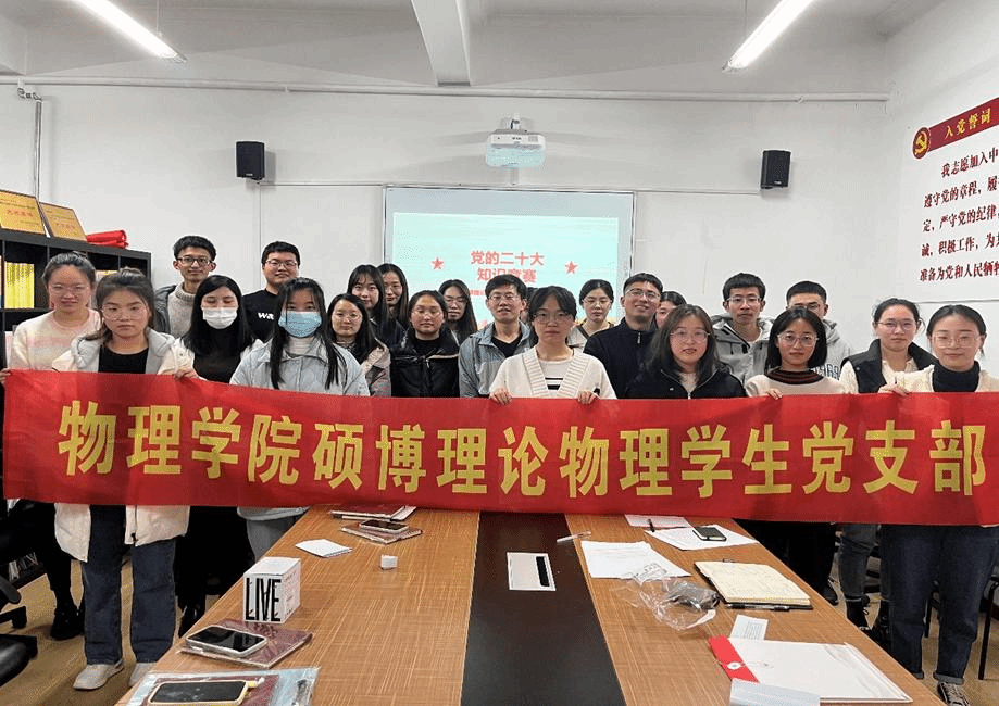 为深入学习习近平新时代中国特色社会主义思想,激发党员学习贯彻党的二十大精神的热情,不断弘扬中国共产党人的精神谱系系列精神,切实增强党员的思想与理论修养。同时,为不断壮大支部发展理论,为党组织吸收优秀的新鲜血液,不断扎实做好党员发展工作。硕博理论物理学生党支部于2022年11月29日晚7点在物理楼422采取线上与线下相结合的方式开展了基于弘扬伟大抗疫精神与党的二十大精神的理论学习与知识竞答和讨论预备党员接收相关事宜。本次会议由支部书记刘玉强同志主持,支部党员、发展对象以及积极分子参加。