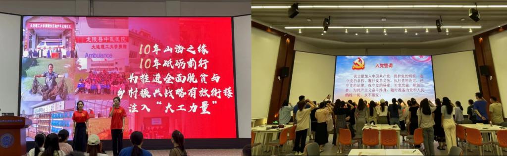 接下来,活动邀请到全校微党课大赛中获得第二名好成绩的马克思主义学院王犇同志和王文韬同志进行题为《山海缘未了,连理情更深——从脱贫攻坚走向全面乡村振兴》的微党课分享。两位党员激情澎湃的讲述了“十年山海之缘,十年砥砺前行”“民族要复兴,乡村必振兴”“乡村振兴,关键在人才,希望在青年”等内容获得与会党员一次又一次的掌声,激起各位同志的学习热情,大家纷纷表示,一批又一批大工人以久久为功的定力续写着一段又一段的连理之情,我们作为新时代的大工学子,也要以大连理工大学驻村书记和脱贫攻坚模范为榜样,牢记党的教诲,立志民族复兴,不负韶华、不负时代、不负人民,为推进全面脱贫与乡村振兴战略有效衔接注入强劲的“大工力量”。活动最后,全体与会党员面向党旗重温入党誓词。