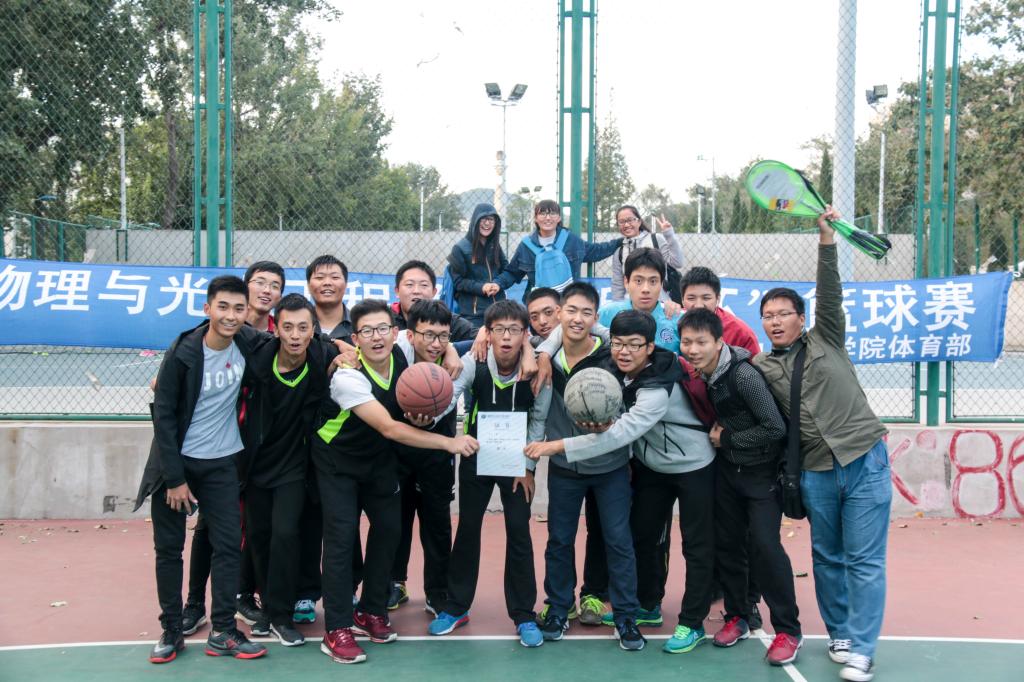 冠军争夺赛在物理1602班和物理1603班之间展开。上半场比赛刚开始,物理1602班凭借队员的技术优势频频得分,占取上风,但是处于劣势的物理1603班队员也不甘落后,开始调整战术,进行反击,比赛场面十分激烈。场边的拉拉队员们也奋力地为各班队员加油助威。最终上半场比赛以物理1602班领先结束。