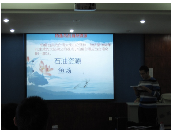 孙汉联同学将钓鱼岛事件讲解分为三部分,分别为购岛风波、钓鱼岛的历史背景和热点时政评论。他结合当今世界局势分析了中日美的关系,并对日美的态度背后进行了深入的剖析。讲解中结合视频、图片,让大家更直观的了解整个事件。同学们反响热烈,各抒己见,展示了当代大学生心系国家,敢于担当的情怀。