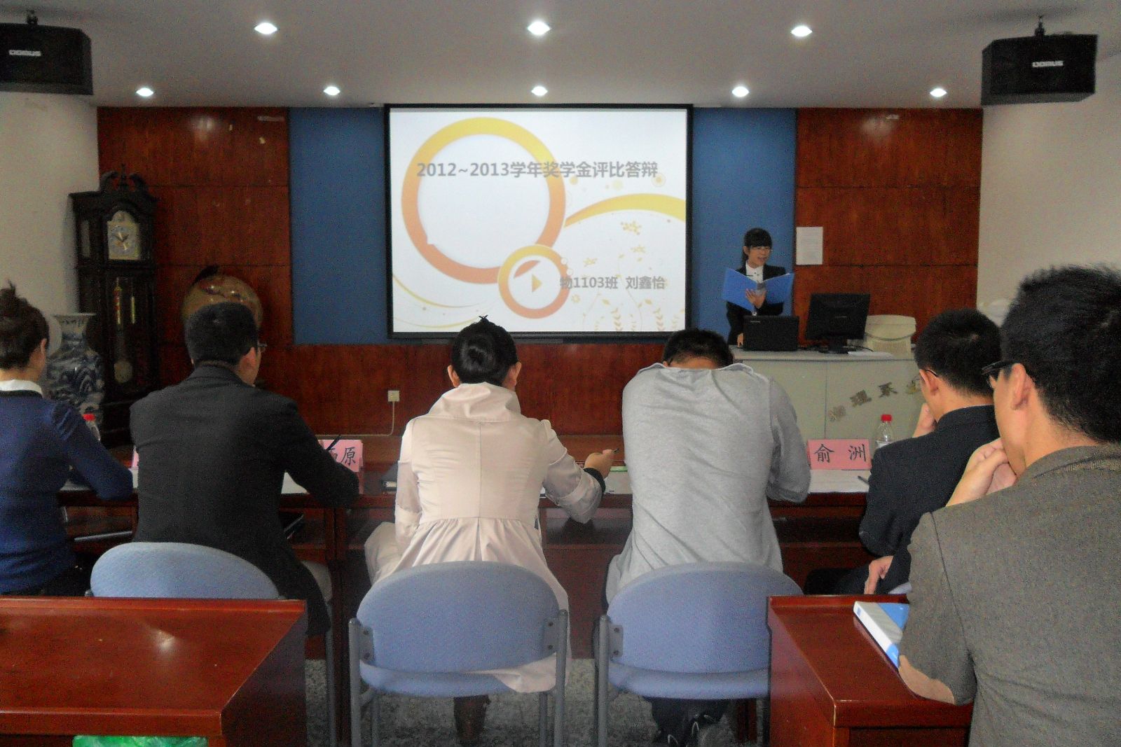 为促进学院精英人才培养,激发学生学习热情,进一步推进学院学风建设, 2013年10月19日上午九点整,物理与光电工程学院201-2013学年专项奖学金评选答辩会在物理系楼322举行。担任此答辩大会评委的有:学院党委副书记兼副院长杨木老师、教师代表李崇老师、团委书记佟西源老师、12级辅导员纪丹红老师、13级辅导员俞洲老师以及学生代表团委副书记金美晨同学。
