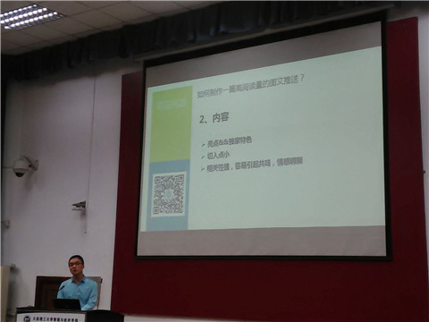 最后,朱杰同学又根据自己的实际经验向大家分享了成功建设微信平台的几点宝贵建议,勉励在场同学要持之以恒,迎难而上,明晰定位,多方交流,赢得了在场同学的广泛认可与赞扬。