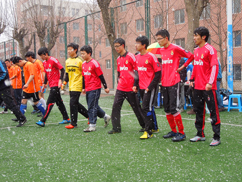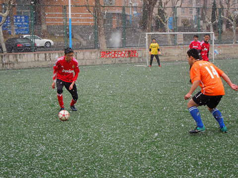 比赛天气十分恶劣,天空中下着大雪,赛场温度很低。但糟糕的天气丝毫没有减轻队员们的斗志,上半场一开场,两队拼抢便十分积极。物理队采取防守反击的打法,软件学院队则大举压上,一时物理队略显被动,门前险情频发,不过都被队员们一一化解。终于,上半场将要结束时,物理队队长朴敏清抓住机会打出了一波漂亮的防守反击,软件队守门员扑球脱手,物理队1:0领先。