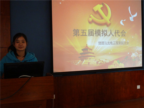 3月15日下午,由物理与光电工程学院团学社理论学习中心组织举办的第五届模拟人民代表大会分会在物理系楼322顺利召开。该会议模拟了人代会召开的情景,采取比赛的形式,由参赛选手提出议案,并回答评委的问题。出席本次会议的评委有我院的团委常务副书记金美晨、组织部部长崔佳琪、青年志愿者协会会长王加彬、实践部部长殷旭飞、理论学习中心主任刘鑫怡以及来自校理论研究会的刘金栋。