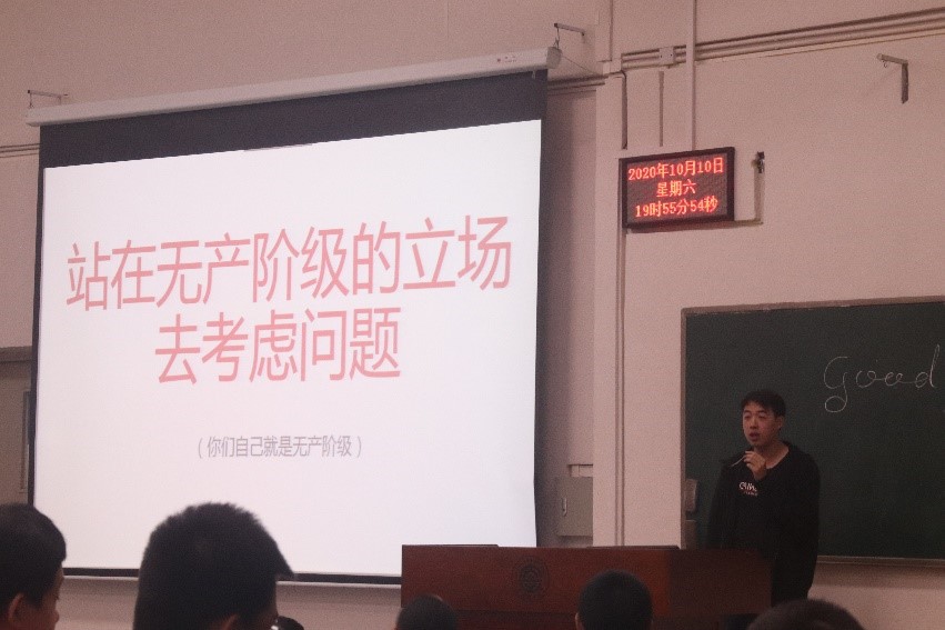 最后上台的李雨萌以网络热词“又红又专”为主题为同学们介绍什么是“专”,为新生推荐有用的学习网站和平台,为同学们讲述学习的目的——提升自我,而不是应付考试。他也从“红”的角度为同学们解释马克思主义思想的核心——自由,引导同学站在无产阶级的立场考虑问题,发人深省。