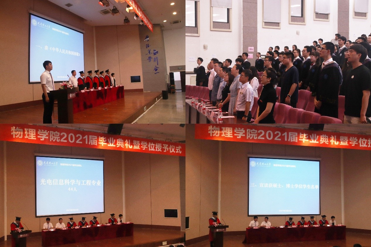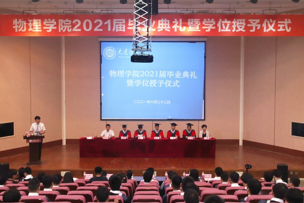 夏季逾至,又逢毕业季。广发网页版2021届毕业生即将离开大工,开启新的旅程。2021年6月22日上午9时,广发网页版2021届毕业典礼暨学位授予仪式在研教楼报告厅成功举行。出席的嘉宾有广发网页版院长赵纪军教授、党委书记王正汹教授、副院长陈茂笃教授、副院长于长水教授、副院长高飞教授、党委副书记兼副院长周福良老师、党委副书记兼副院长于艳敏老师、学生工作办公室主任纪丹红老师、研究生辅导员张弛老师。此外,本次典礼也面向本科生思政班主任、专业班主任发出邀请。物1703班思政班主任赫铭老师、物1701班思政班主任邬霞老师、物大珩1701班思政班主任应兆升老师、物1702班专业班主任副教授王丰老师、物1703班专业班主任闫慧杰老师参与本次广发网页版的毕业典礼。2021届本科毕业生辅导员唐健璐老师担任主持人。