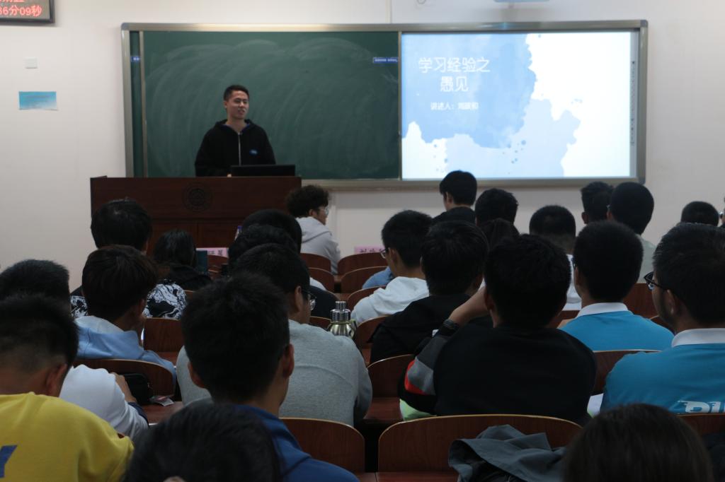 刘政和同学从大学与高中的区别、物理专业的特点、个人学习习惯三点分享自己的学习经验。他告诫同学们上课认真听讲、作业独立完成。