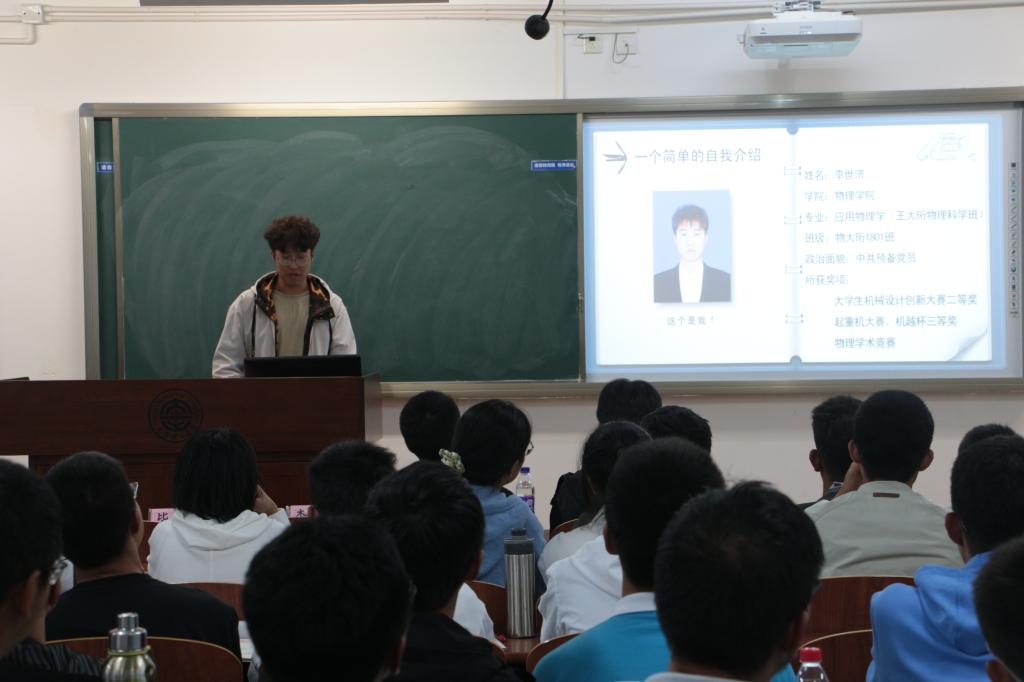 李世济同学凭借自己丰富的科创竞赛经验向同学们分享自己的心得体会。他以物理实验竞赛为例,结合亲身经历,详细地介绍了物理实验竞赛、物理学术竞赛、数学建模竞赛、互联网+大赛等竞赛的规则及特点。